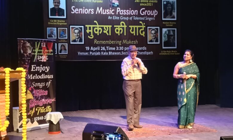 चण्डीगढ़ : सीनियर्स म्यूज़िक पैशन ग्रुप (एसएमपीजी), चण्डीगढ़ द्वारा पंजाब कला भवन, सेक्टर-16, चंडीगढ़ में जाने कहाँ गए वो दिन – मुकेश की यादें शीर्षक से एक मधुर संगीतमय कार्यक्रम का आयोजन किया गया। इस कार्यक्रम में महान गायक मुकेश के सदाबहार एकल एवं युगल गीतों की प्रस्तुति दी गई।