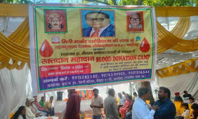 मिनी मार्केट एसोसिएशन सेक्टर 9 डी की तरफ से भारत रत्न डॉ भीम राव अम्बेडकर जी की जयंती के उपलक्ष्य में रक्तदान कैंप आयोजित किया गया। इसमें लोगों ने बढ़ चढ़ कर भाग लिया। सभी रक्त दानियों को सर्टिफिकेट प्रदान किए गए। आए हुए गणमान्य व्यक्तियों का हार पहना कर सम्मानित किया गया।